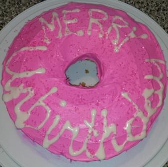 I’d never made a tube cake before. I was most concerned about turning the thing over once it was done, since I needed it to be wide-side-up. I made the cake a day ahead, so it would have plenty of time to cool before I took the frosting to it (and also in case it fell apart completely). It came out great! Here’s the cake: